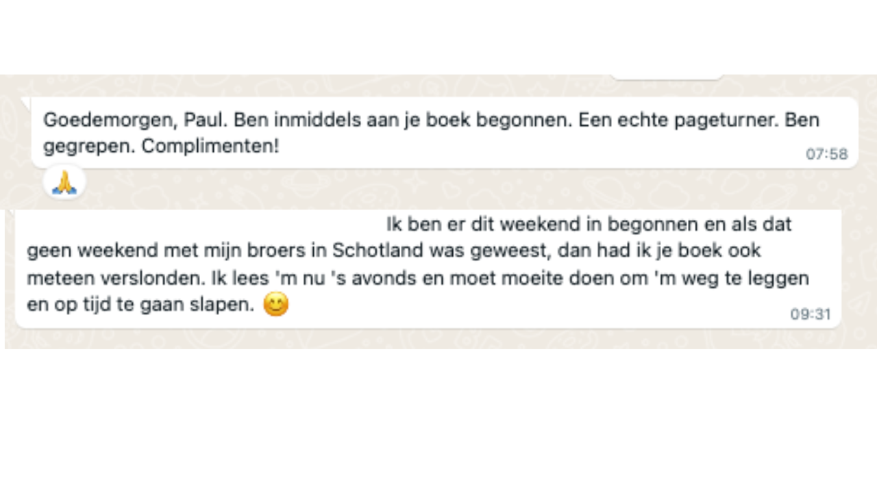 “Een gelaagde psychologische thriller. Eenmaal begonnen kon ik hem niet meer wegleggen. Pakkend van begin tot eind. Beklemmend hoe fictie en realiteit verstrengeld raken tijdens het lezen van deze pageturner.” – Paul van Ruiten (consultant, trainer/ visualisaties bij Bureau Om, deelnemer De Zwerm)