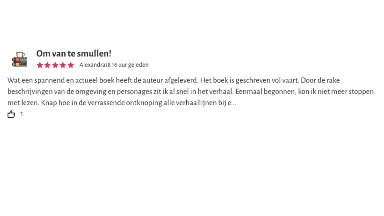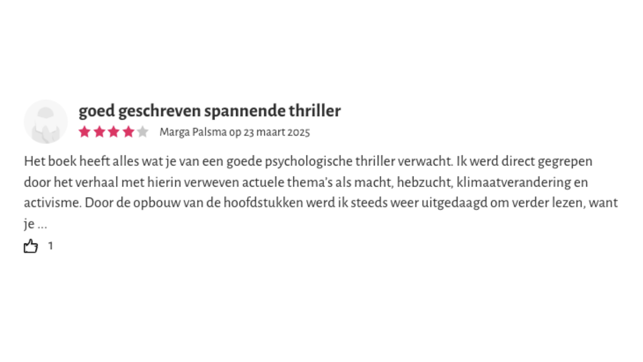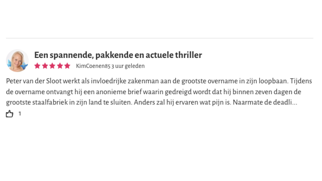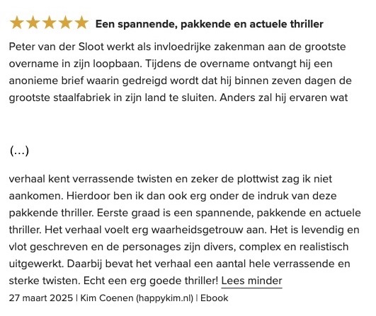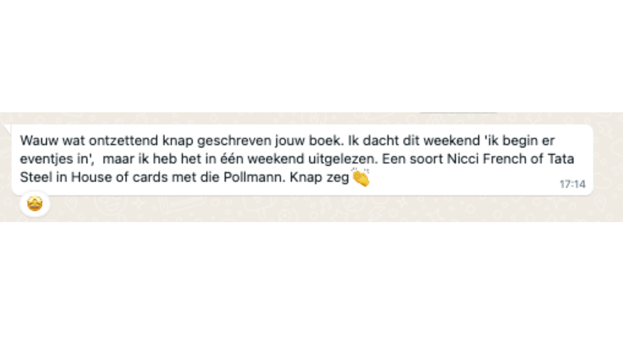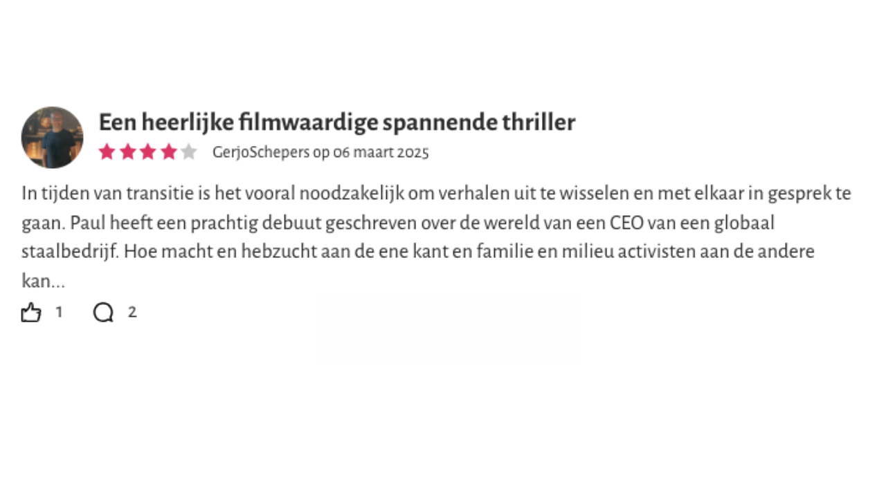 “Een thriller die onder je huid kruipt. Meeslepend en scherp geschreven, met een diepere laag over macht, ethiek en de moed om verantwoordelijkheid te nemen. De dynamiek in de staalindustrie voelde herkenbaar—net als de morele dilemma’s die leiderschap met zich meebrengt. Een intrigerend debuut dat je laat nadenken én je nachtrust kost. Aanrader!”, Sonja Wekema, oprichter The Other Perspective en auteur van ondermeer Leading in a Wicked World.