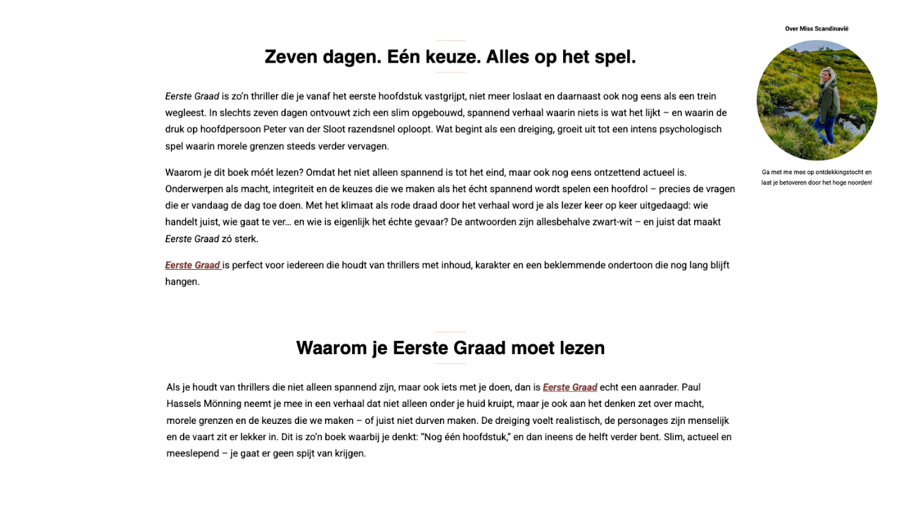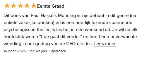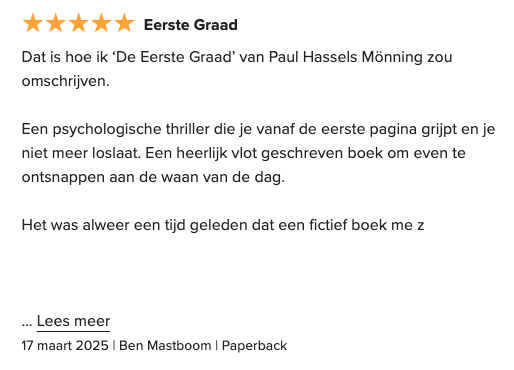 “Eerste Graad” is een verhaal dat je meteen vanaf het begin bij je kladden grijpt om je daarna niet meer los te laten. Paul levert een thriller op vol spanning, scherpe dialogen en actuele thema’s die nog dagen door je hoofd spoken. Geen opsmuk, gewoon goed geschreven en blijvend boeiend!, Egbert Jan van Bel (bestseller auteur managementboeken, oprichter Beeckestijn Business School).