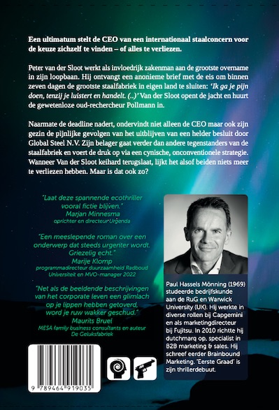 “De ecothriller van Paul Hassels Mönning leest als een bloedstollende roman en ‘thrilt’ als het ware na. Het draait om een situatie die steeds vaker in de corporate wereld opgang doet. Een invloedrijke CEO krijgt plotseling een ultimatum om andere keuzes te maken ten koste van zijn bedrijf maar ten bate van een betere wereld. Zijn activistische belager tart hem tot het uiterste. Als leider van een staalbedrijf moet hij over stalen zenuwen beschikken. We kennen de acties van partijen als Milieudefensie, Extinction Rebellion en Greenpeace. In dit verhaal wordt daar een schepje bovenop gedaan omdat de schrijver bijzondere dimensies van goed en kwaad op een persoonlijke wijze weet te vermengen tussen de CEO en zijn activistische belager. Het is een zeer actueel en ook realistisch thema dat laat zien waar de klimaatcrisis allemaal toe kan leiden. Het bedrijfsleven heeft van oudsher het begrip aandeelhouderswaarde centraal gesteld. In dit verhaal wordt de lezer op het spoor gezet van het grote belang van ‘earthholdervalue’. Door die bril kijken levert nieuwe perspectieven op. Het zou een mooie bijvangst zijn als meer lezers die bril opzetten.”, Gijs de Vries (vervult diverse toezichthoudende functies en is actief als executive coach. Hij was lid van directie van Capgemini, lid van de RvB van EY en was algemeen directeur van het Rode Kruis).