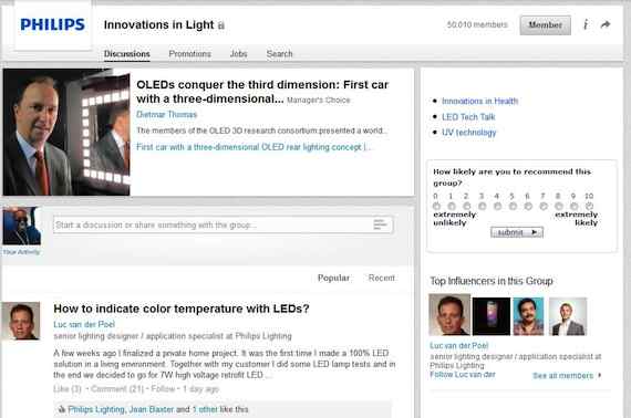 Zo ondersteunt Philips Lighting de community van lichtontwerpers en architecten met de LinkedIn ‘Innovations in Light’ groep. Met inmiddels vele tienduizenden leden deelt deze groep inhoudelijke vragen en inzichten met elkaar. Philips Lighting ondersteunt de online conversatie actief en bouwt op die manier aan een meer toegankelijk, menselijk gezicht naar deze doelgroep van beïnvloeders in de zakelijke lichtmarkt.