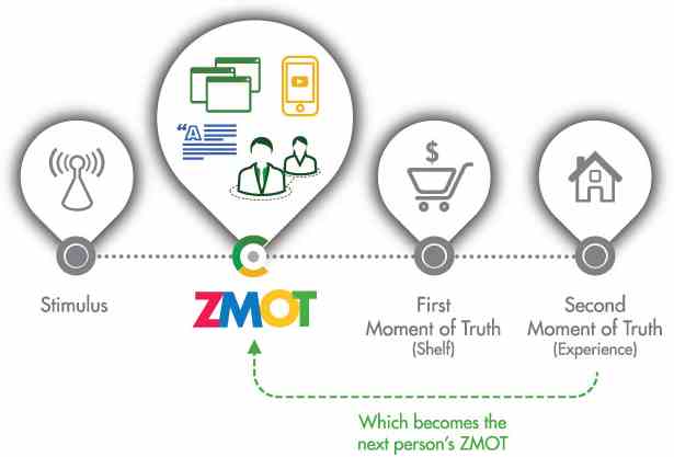 ZMOT gaat bijvoorbeeld om het opzoeken van informatie, het vergelijken van prijzen of de ervaringen met een bepaald product. ZMOT kortom is het moment dat je je smart phone, iPad of desktop computer pakt en op het web zoekt naar relevante informatie en kennis over het product of service dat je overweegt te kopen.